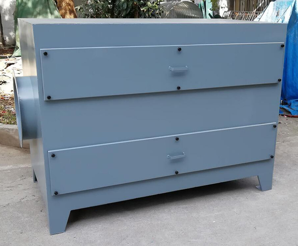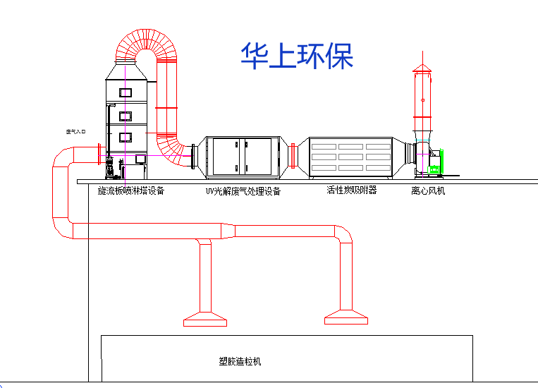 橡胶厂有机废气处理设备工作原理是:废气进入喷淋塔处理装置,首先经洗涤处理工艺段,去除颗粒物与粘稠物质,再经光解废气处理设备,然后再次进入到活性炭吸附箱进行吸附处理,洁净的空气经离心风机排出。